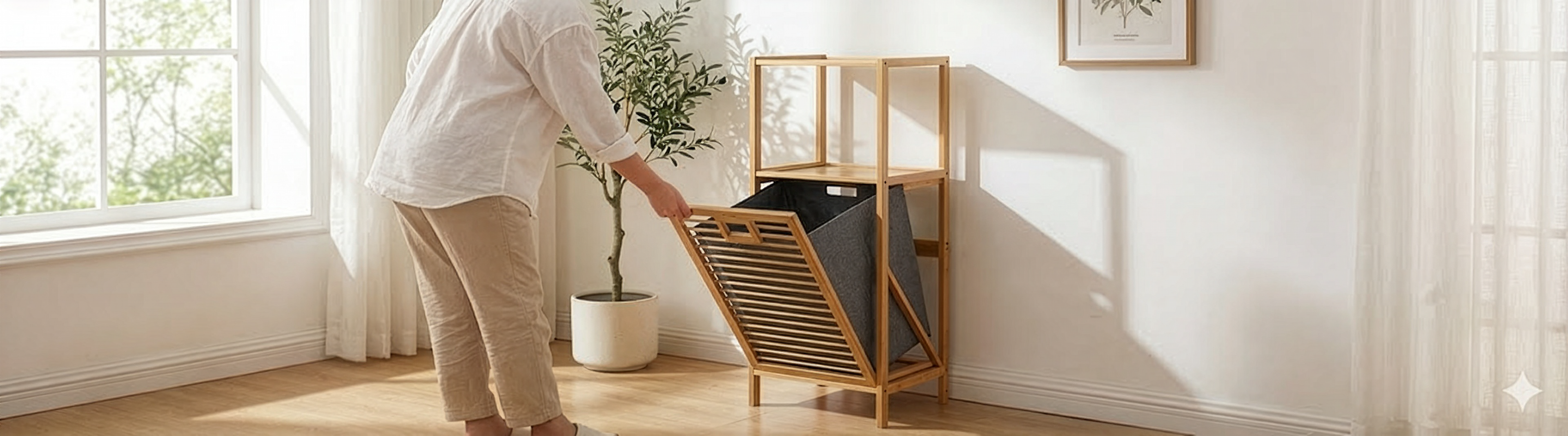 Bambu Kirli Sepetli Dolap, 2 Katlı, Çamaşır Sepeti, Banyo Dolabı