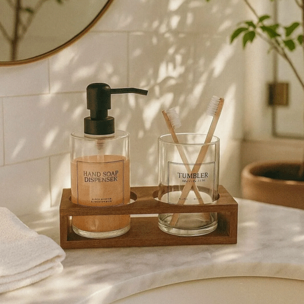 Akasya Stantlı Tumbler Cam Sabunluk ve Diş Fırçalık Seti, Banyo Sıvı Sabunluk 430ml